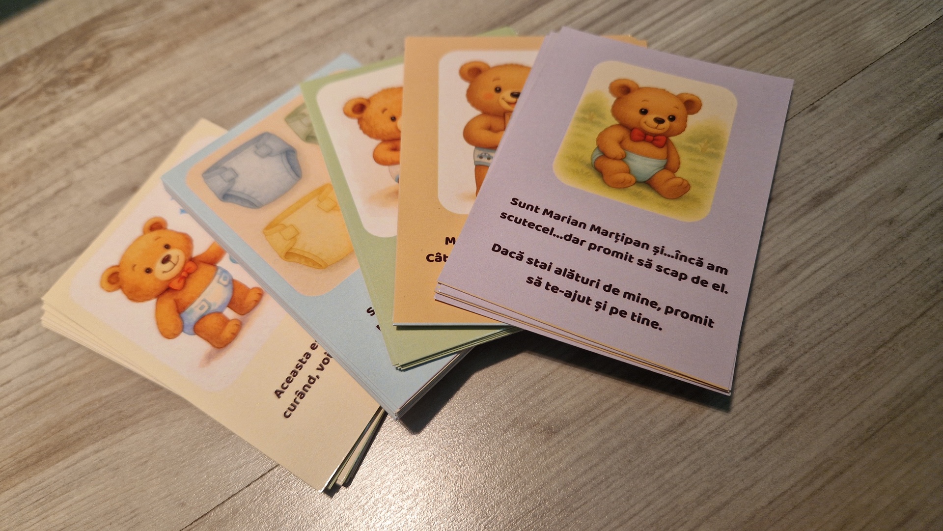 • 40 de carduri mici: rutină, vocabular și emoții legate de folosirea olitei